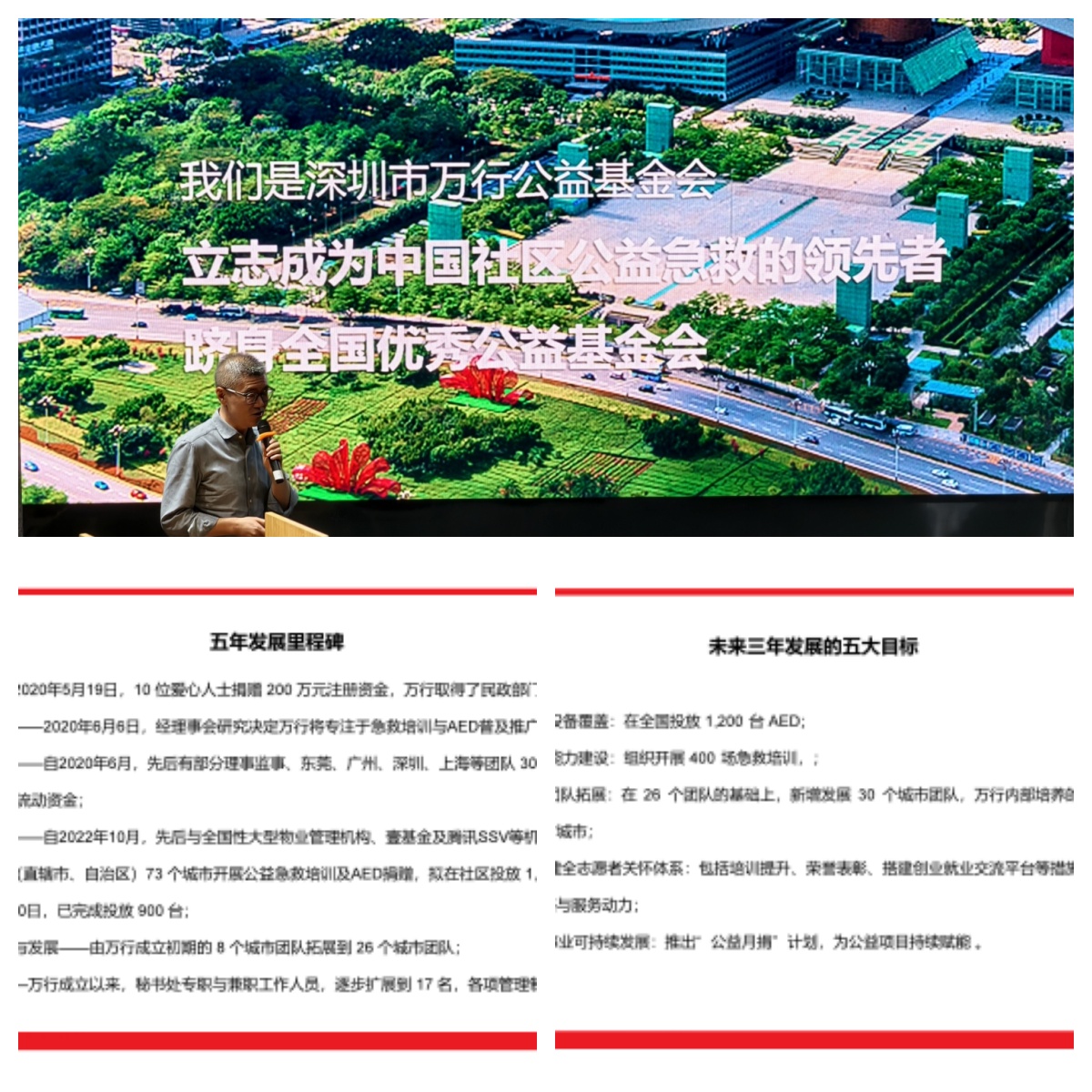 深圳市万行公益基金会是由王石及前万科高管刘爱明、丁福源等人共同发起的非公募公益基金会,自 2020 年 5 月成立以来,在社区公益急救领域深耕五载,成绩斐然,公益急救项目覆盖全国29省市,累计捐赠AED设备931台,开展培训活动825场,惠及近300万人次。
