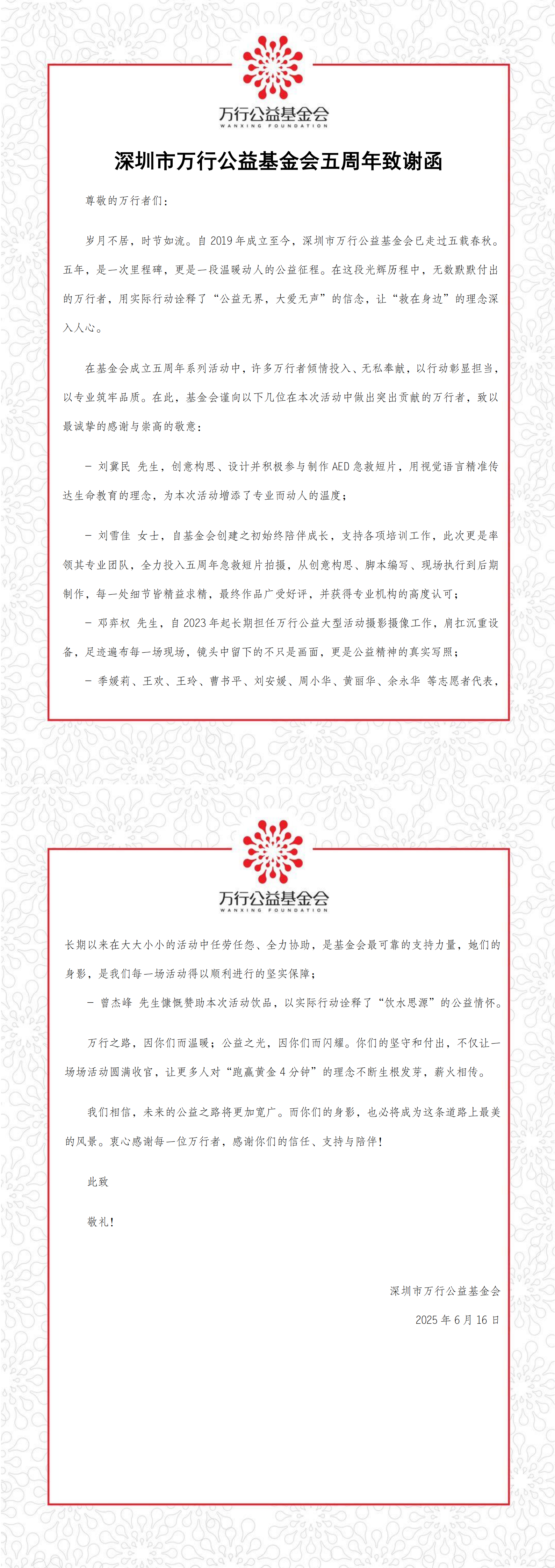 深圳市万行公益基金会五周年致谢函