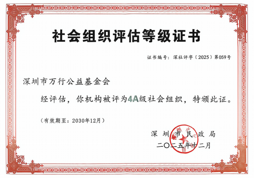 2025年12月25日,深圳市社会组织管理局正式公布2025年度深圳市社会组织等级评估结果。深圳市万行公益基金会顺利通过评审,成功获评“深圳市4A级社会组织”,等级有效期至2030年12月。