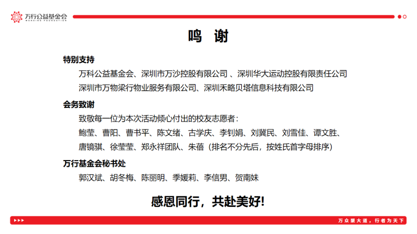 相聚短暂,情谊绵长。首届万科校友会的落幕,是万科校友文化传承的新起点。未来,深圳市万行公益基金会将继续深耕校友服务,持续搭建高质量的交流共享平台,凝聚万科校友力量,助力创新创业实践,让 “万众创想” 的理念持续传递,期待下一次温暖重逢!