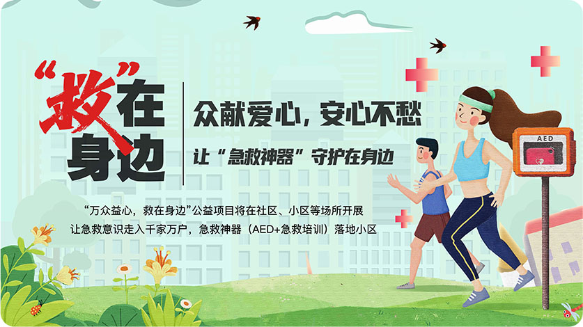 “万众益心,救在身边”公益项目将在社区、小区等人口流动量大、意外发生率高、环境相对封闭或发生意外后短时间内无法获得院前医疗急救服务的场所配置AED并开展急救知识培训,让更多人懂急救、会急救。
